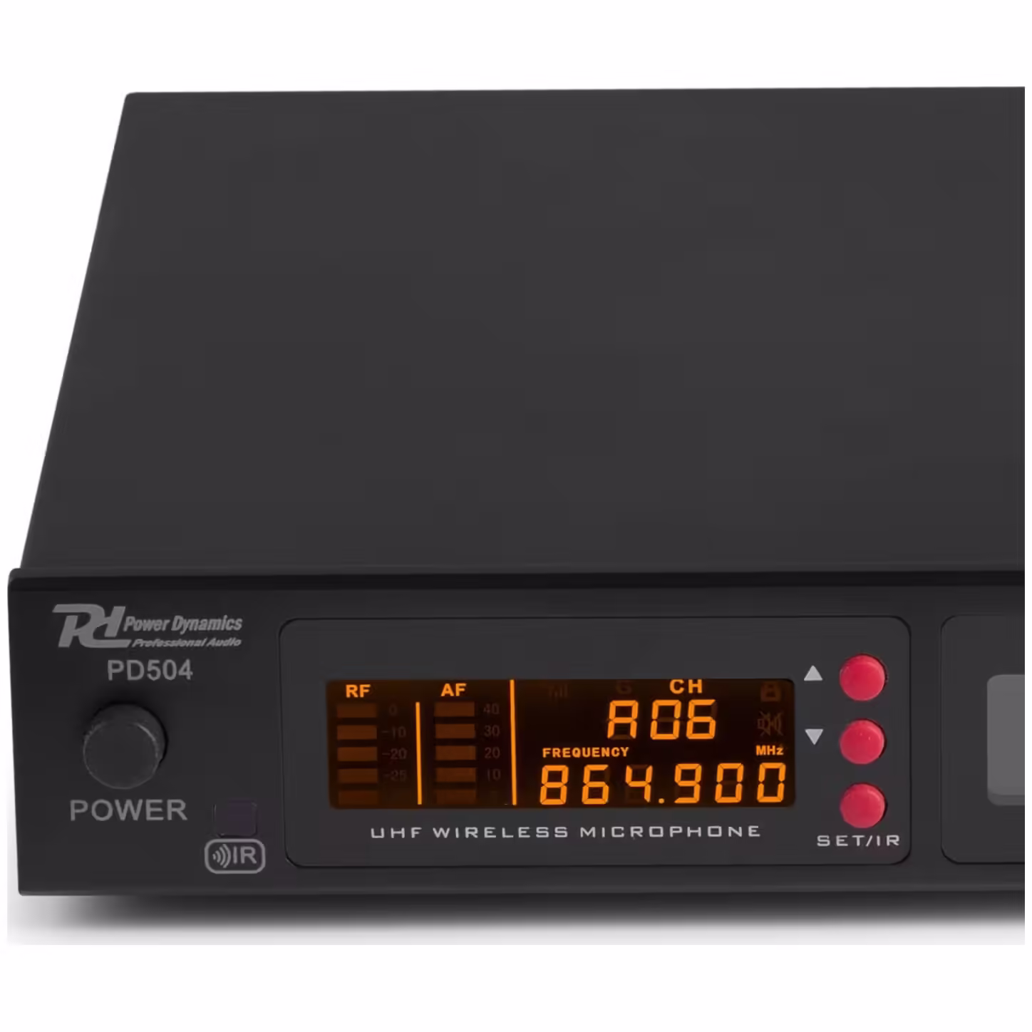 Професионален безжичен микрофонен комплект PD504B от Power Dynamics с UHF честота, предназначен за сцена, студио и живи изпълнения. Комплектът включва 4 джобни безжични предавателя с възможност за избор от 50 различни канала.