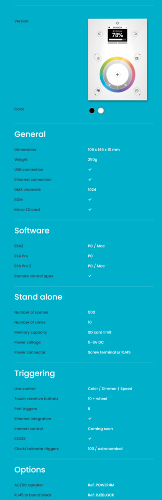 STICK-DE3 е проектиран за управление на сложни осветителни системи чрез опростен тъчскрийн интерфейс. Контролерът разполага с интегриран графичен цветен дисплей, бутони за управление на цветовата гама, интензитета, режим на работа, скорост на сцената и навигация в менюто.